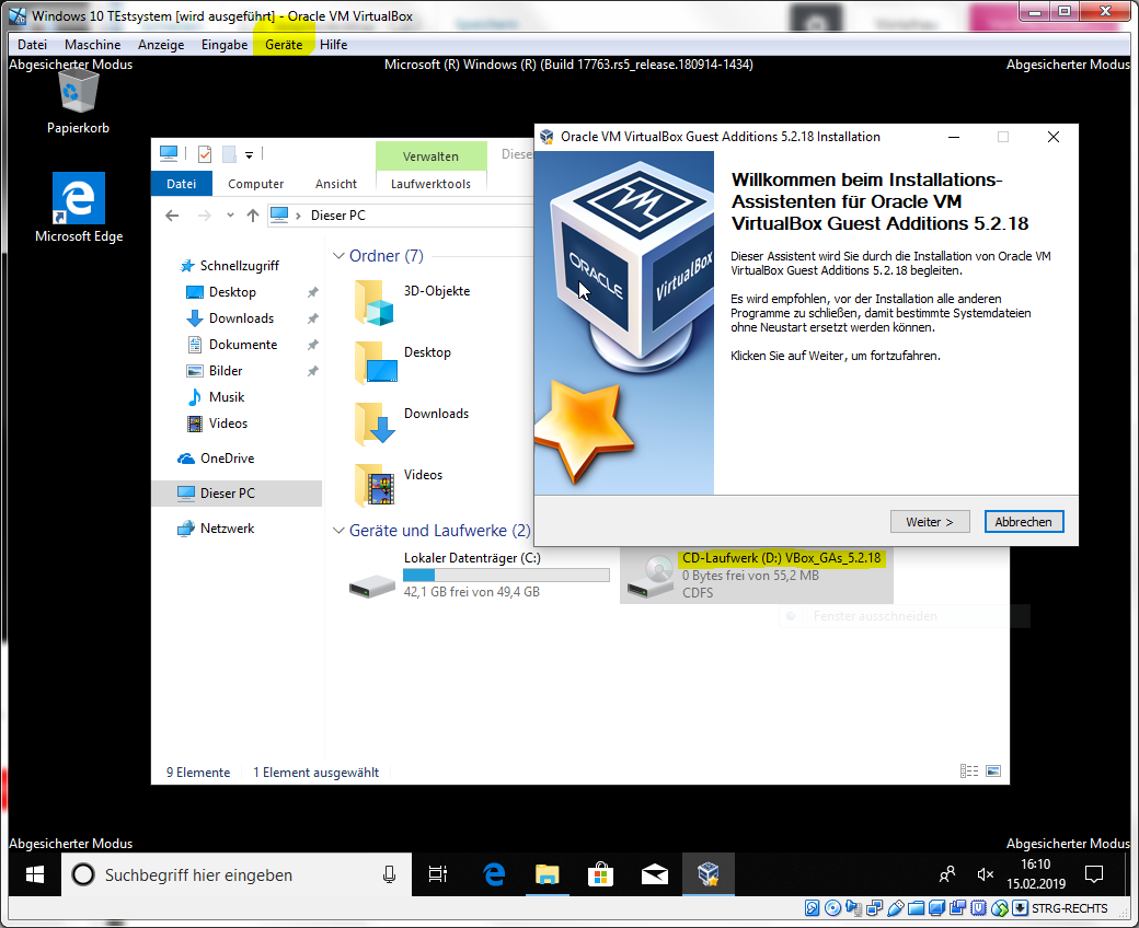 Hat Windows dann wieder gestartet, klicken wir im VirtualBox-Fenster oben auf das Menü „Geräte“ und „Gasterweiterung einlegen“. Im Gastsystem öffnen wir mit einem Doppelklick auf das CD-Laufwerk nun das Installationsprogramm. Alternativ kann das CD-Verzeichnis aufgerufen und die Setup.exe eigenständig gestartet werden. Wir klicken uns durch das Installationsprogramm und wählen Gerätetreiber installieren? Zulassen und Oracle vertrauen. Anschließend startet ihr Windows neu und