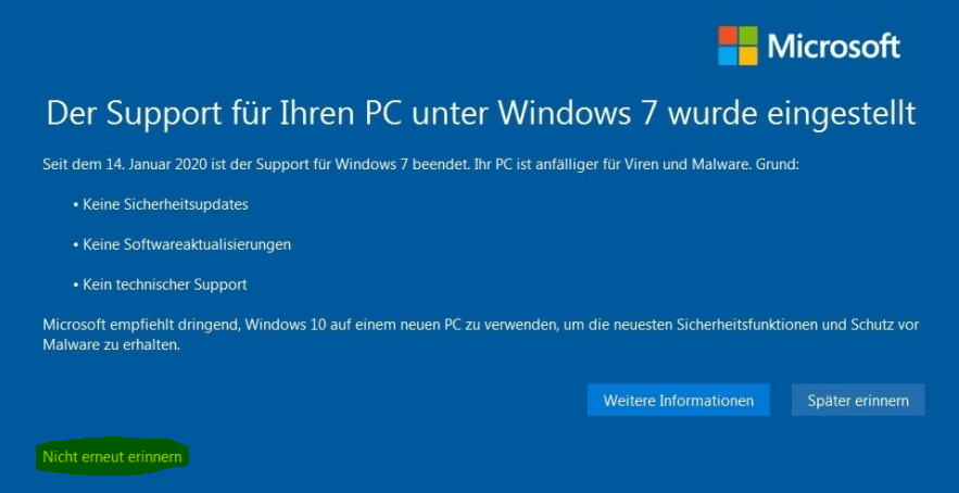 Dass am 14. Januar 2020 der offizielle Unterstützungszeitraum für Windows 7 ausgelaufen [1] ist, dürften die meisten Nutzer inzwischen wohl mitbekommen haben. Wer sein Windows 7 noch etwas weiter nutzen möchte (auf eigenes Risiko natürlich!) und sich an den gelegentlichen End-of-Life Erinnerungen stört, hat mehrere Optionen. Neben der eingeblendeten „Nicht erneut erinnern“ Option