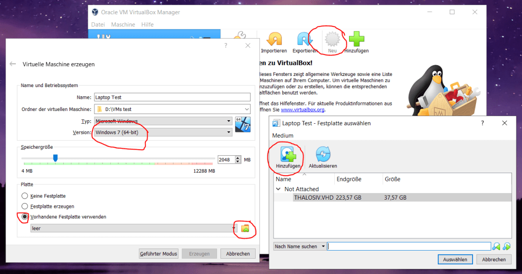 Wurde der Vorgang erfolgreich abgeschlossen, habt ihr nun ein mehrere Gigabyte großes VHD-Abbild eures Rechners. Im Host-System (wo der virtuelle Rechner dann ausgeführt wird) startet ihr nun das zuvor installierte VirtualBox und legt eine neue Maschine an (über den Button „Hinzufügen“). Wählt das passende Betriebssystem (und Architektur!) und bei der Festplatte unbedingt „Vorhandene Festplatte verwenden“ und dann das Abbild.