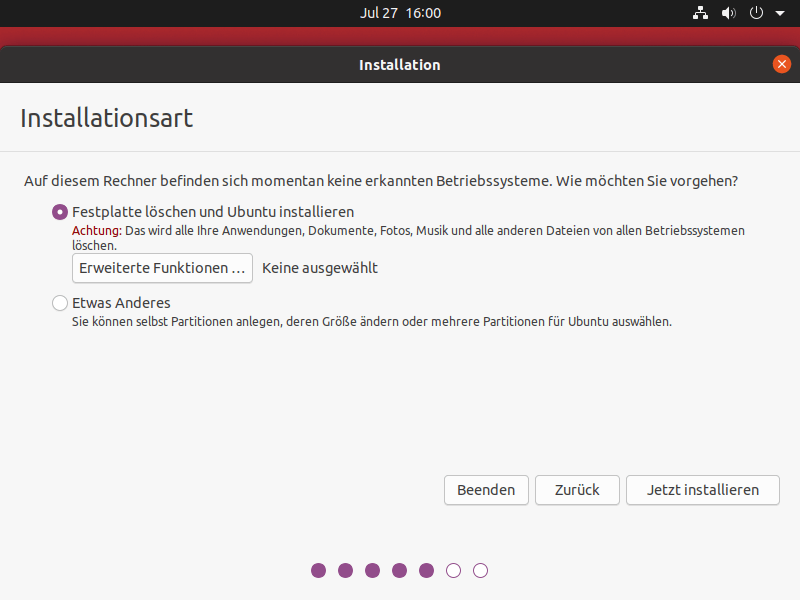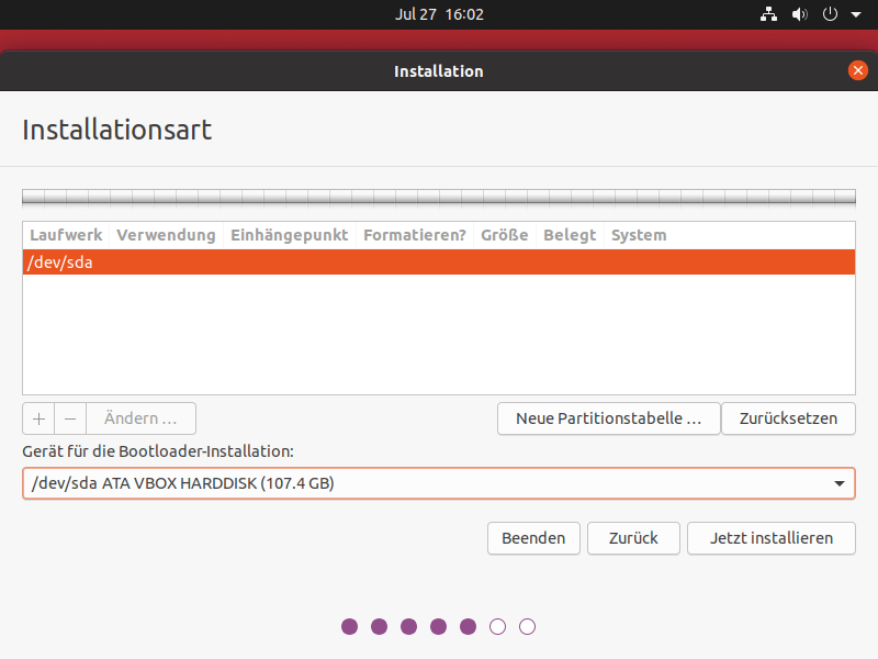 Nachdem man die Installation beispielsweise über einen USB-Speicherstick gestartet hat, begegnet einem der folgende Dialog bereits nach wenigen Klicks. Wählt man einfach „Festplatte löschen“ und überlässt die Partitionierung dem Setup, sieht das beispielsweise bei einem Datenträger ca. 100 Gb so aus (dargestellt mit VirtualBox).