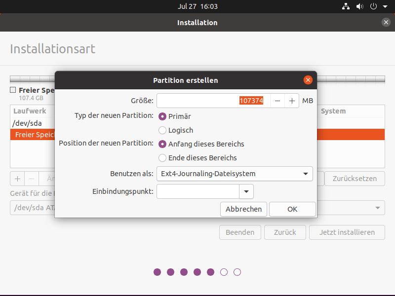 Tipp: 100Gb verfügbarer Speicherplatz entspricht einer Partitionsgröße von 102400 Mb!