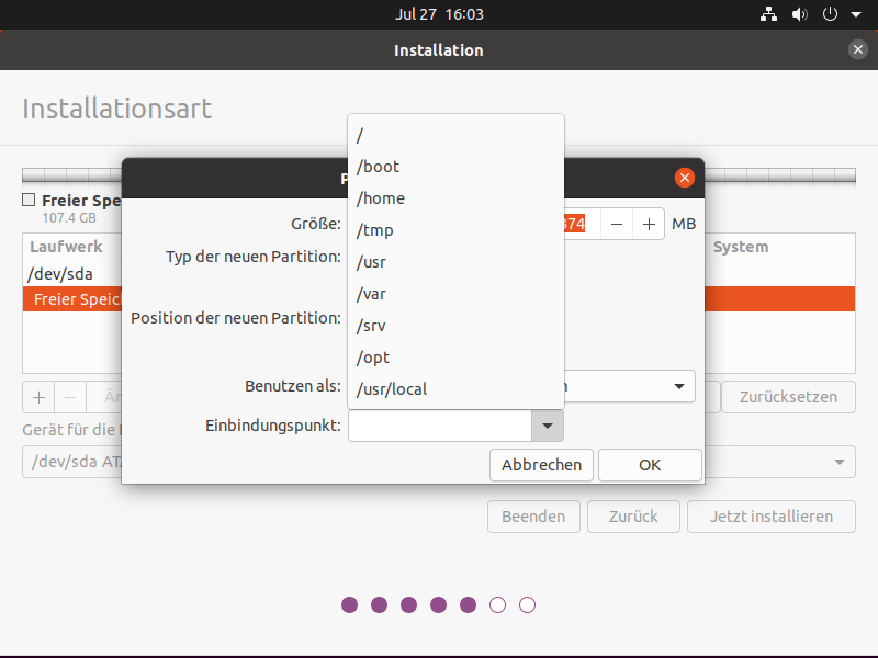 Wie im Bild zu erkennen ist, bietet das Setup im Drop-Down-Menü Einbindungspunkt schon die wichtigen Partitionsbezeichnungen als Vorlage an. Ist die Festplatte noch komplett leer oder soll komplett gelöscht werden (also auch kein Windows installiert), muss zunächst eine neue Partitionstabelle erstellt werden. Achtung: Während die neue Einteilung zunächst geplant und erst zum Schluss auf die Festplatte geschrieben wird, wird die neue Partitionstabelle sofort übernommen. An die Datensicherung denken! Wollt ihr nun eine /boot – Partition einrichten, sollte diese logischerweise „am Anfang dieses Bereichs“ [des leeren Datenträgers] erstellt werden.