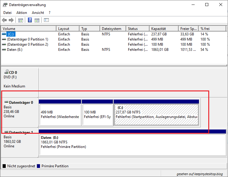 Schema aus Windows 10: Datenträger 0 (C:) mit Boot- und Recovery-Partition, der Rest sind System- und Nutzerdaten.