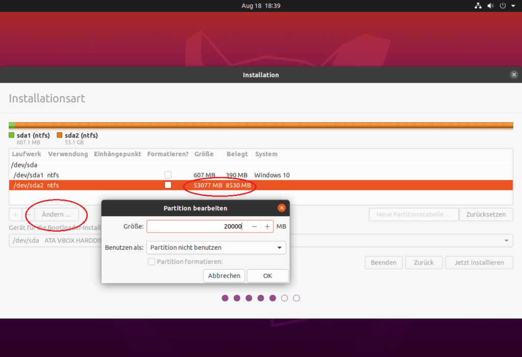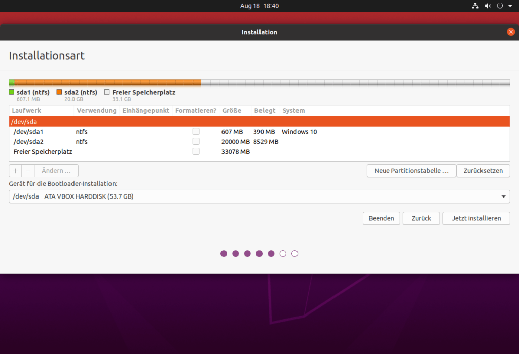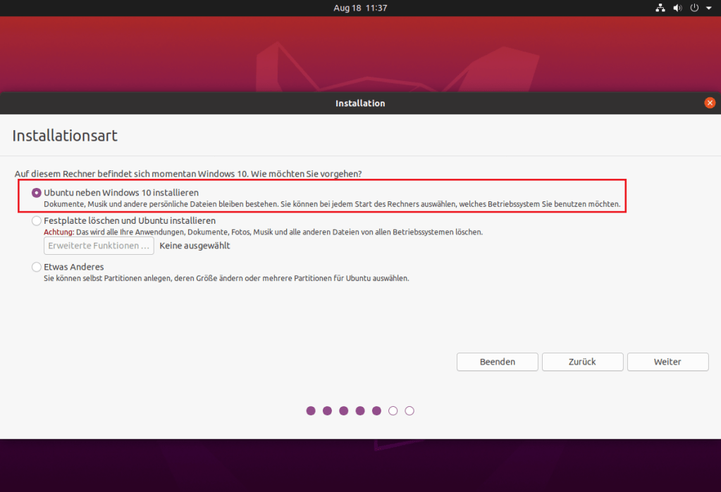 Das Setup von Ubuntu (20.04) bietet wie auch die Vorgänger bereits eine automatische Dual-Boot Partitionierung während der Installation an.
