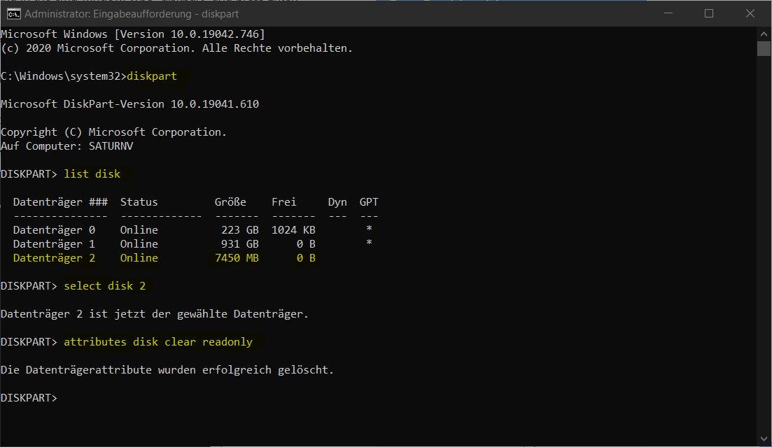 2. Schreibgeschützt-Attribut mit diskpart löschen