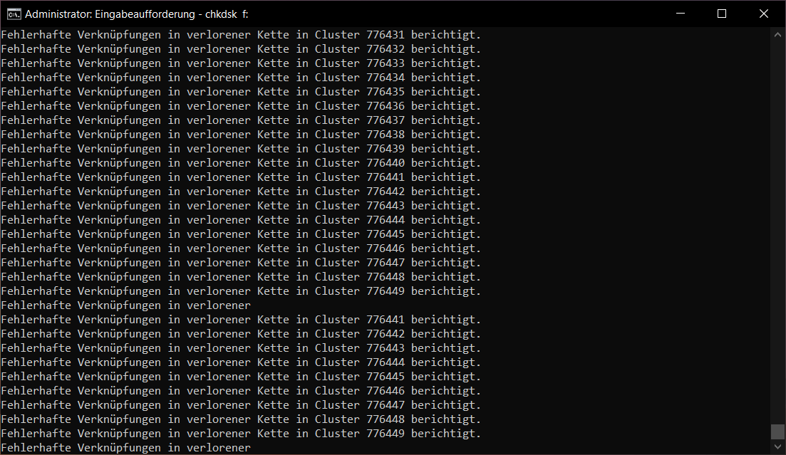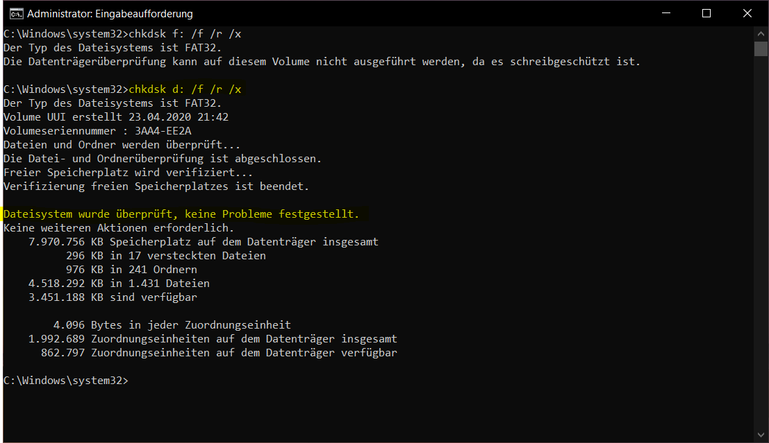 Die Überprüfung dauert je nach Geschwindigkeit und Größe des Datenträgers einige Sekunden bis mehrere Minuten. Sollte das Dateisystem unbeschädigt sein, erhaltet ihr recht schnell eine entsprechende Zusammenfassung (Bild 1). Ist das Dateisystem beschädigt, werden entsprechend Fehlermeldungen ausgegeben (Bild 2). Diese können unter Umständen auch repariert werden, allerdings nur, wenn davor das Problem mit dem Schreibschutz behoben wurde. Ist das nicht der Fall, probiert chksdk ohne Parameter „read only“ auszuführen, um zumindest herauszufinden, ob Fehler vorliegen. Das Reparieren war bei meinem physisch beschädigtem USB-Stick leider nicht mehr möglich.