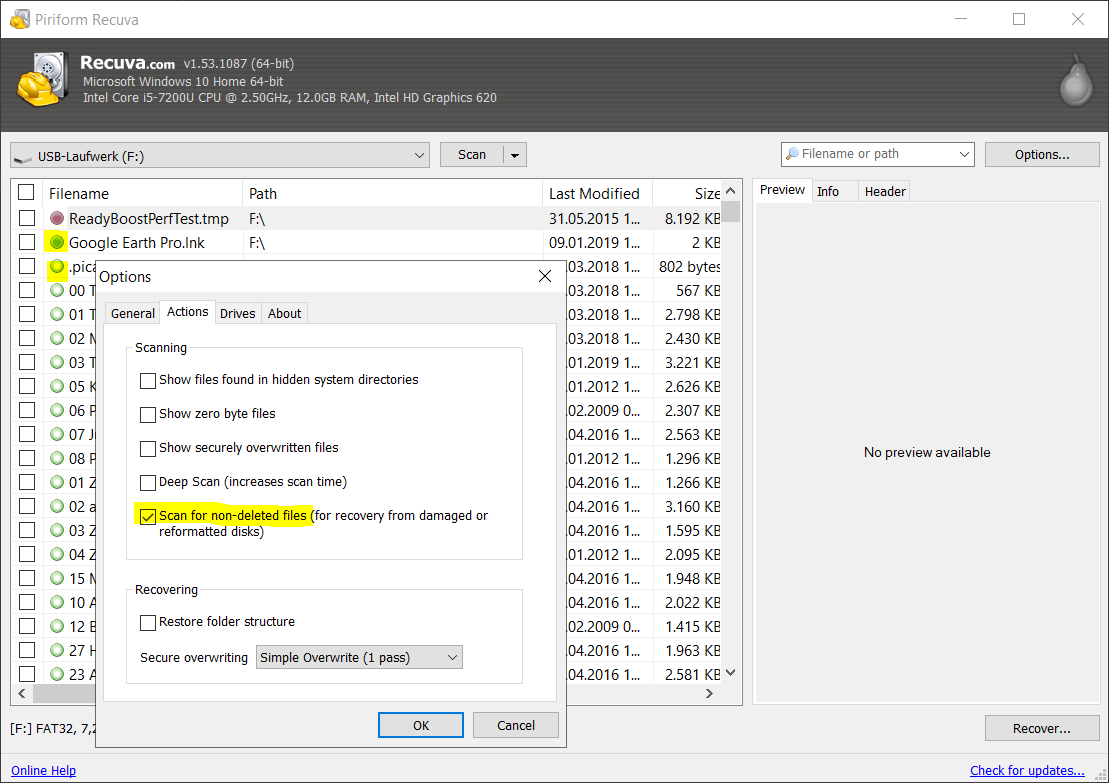 Beim ersten Start den „Wizard“ einfach schließen, im Hauptfenster dann zunächst oben rechts auf „Options…“ klicken. Hier könnt ihr zum einen die Sprache (Language) auf Deutsch stellen, zum anderen ist aber wichtig, dass ihr im Reiter „Actions“ die Einstellung „Scan for non-deleted files (for recovery from damaged or reformatted disks)“ anhakt. Wenn ihr nun die Suche für den betroffenen Datenträger startet, werden neben gelöschten Dateien auch noch die Vorhandenen angezeigt, diese können dann ausgewählt und an einen anderen Speicherort (hoffentlich) extrahiert werden.