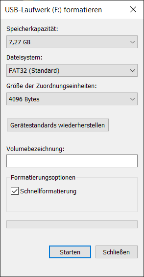 Das ist die Holzhammer-Methode, die ihr nur durchführen solltet, wenn sich auf dem USB-Stick keine wichtigen Daten befinden oder ihr diese bereits gesichert habt. Beim Formatieren werden alle Daten vom Datenträger gelöscht und ein neues Dateisystem eingerichtet. Mit eingehängtem Datenträger unter „Dieser PC“ einen Rechtsklick auf das entsprechende „USB-Laufwerk“ machen und „Formatieren…“ auswählen. Wählt „Gerätestandards wiederherstellen“ und „Schnellformatierung“. Wenn der USB-Speicher nicht beschädigt ist, dauert dies nur wenige Sekunden und wird ebenfalls das Problem mit dem Schreibschutz beheben!