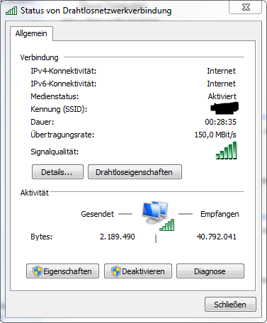 Zunächst öffnen wir über das Tray-Symbol rechts unten oder die Systemsteuerung\Netzwerk und Internet\Netzwerkverbindungen und schauen uns die angegebene Signalqualität (die klassischen Balken) und Übertragungsrate für das Gerät an. Entspricht das der zu erwartenden Nennleistung, oder kann die Hardware eigentlich schneller?