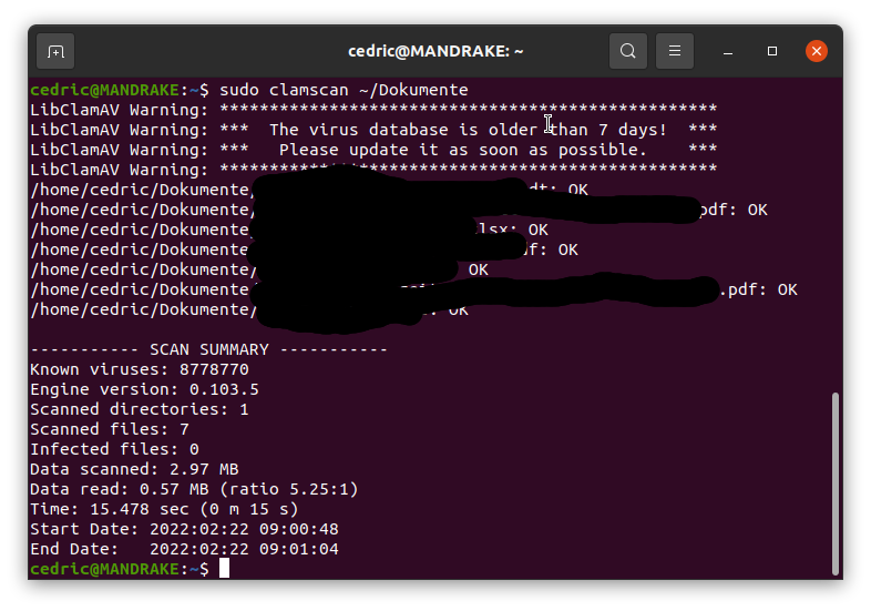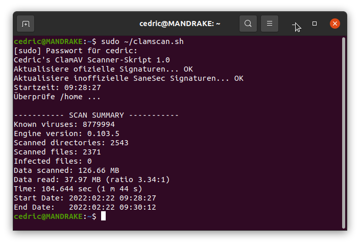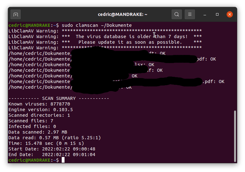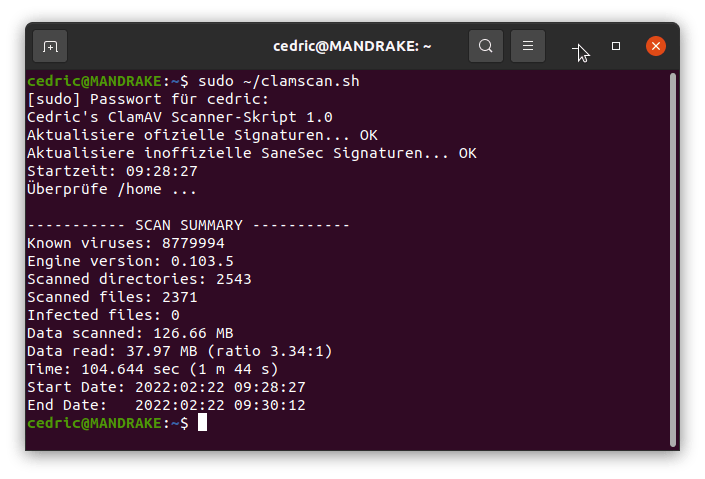 und auch umfangreich konfigurieren, was beispielsweise das Updateverhalten, die Aktion bei Erkennung und das Logging angeht. Darauf möchte ich aber in diesem Beitrag nicht eingehen. Das könnt ihr z.B. hier nachlesen. Scans auf eine Datei oder ein Verzeichnis können im Terminal mit dem Befehl clamscan ausgeführt werden. Auch eine grafische Benutzeroberfläche gibt es (clamtk), die man sich dazuinstallieren kann, aber ich konnte damit nicht viel anfangen.