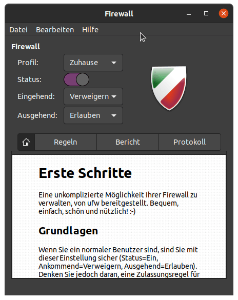Etwas praktischer und – naja – hübscher ist die grafische Frontend gufw für ufw. Damit lassen sich der Status und die Regeln wesentlich komfortabler verwalten. Der Funktionsumfang entspricht ungefähr dem, wie man es von der Windows-Firewall kennt.