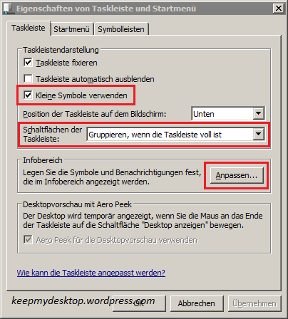 win98_mod2Ist das Design „Windows – klassisch“ aktiv, ist zwar Aero deaktiviert, die Taskleiste bleibt aber weiterhin dem Aero-Design treu. Um das zu ändern klickt ihr mit der rechten Maustaste auf die Taskleiste, um die Einstellungen aufzurufen. Dort setzt ihr einen Haken bei „Kleine Symbole verwenden“ und deaktiviert die automatische Gruppierung der Schaltflächen. Zuletzt ein Haken im Infobereich, um „Immer alle Symbole [im Tray] anzeigen“ zu lassen. Nun sollte die Taskleiste wesentlich besser aussehen!