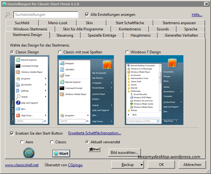 win98_mod3Classic Shell ist ein wunderbares Programm, um das Startmenü unter Windows zu konfigurieren und wird gern dazu genutzt, um unter Windows Vista und neuer das alte Startmenü wiederherzustellen. Das Programm findet ihr hier, kostenlos. Nach der Installation bindet sich das Programm sofort ins System ein. Ihr startet die „Einstellungen für Classic Shell Menü“ um dort im Reiter „Startmenü Design“ das Classic Design zu wählen und ersetzt den Start-Button durch folgende Grafik: